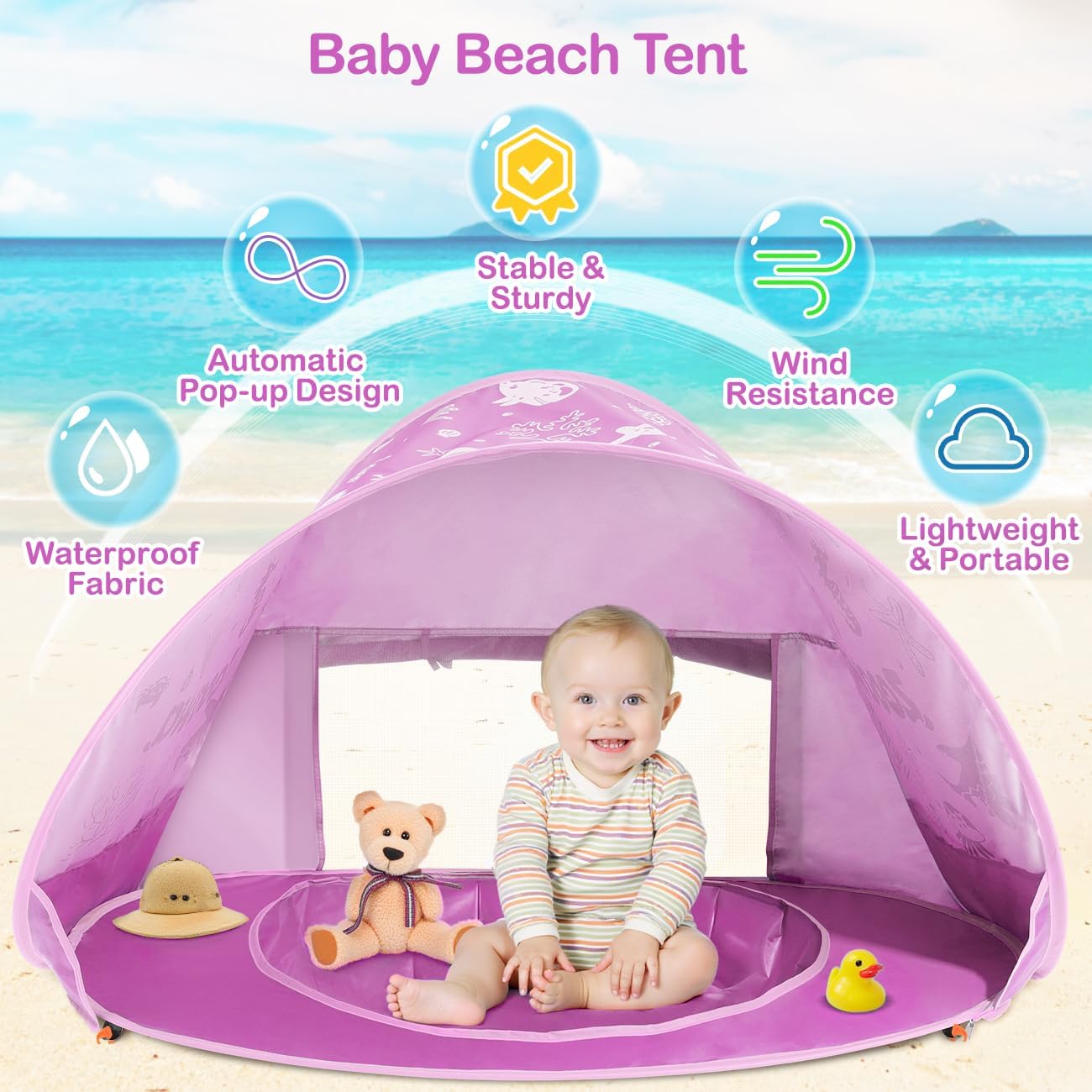 Multi-functional Mini Pool: The beach tent for babies and toddlers has a mini pool at the bottom, so that babies can play water at home, safely and convenient. The mini pool can also be filled with sand. Babies can use ocean molds (included) to press out the animal and exercise the coordination of their hands.