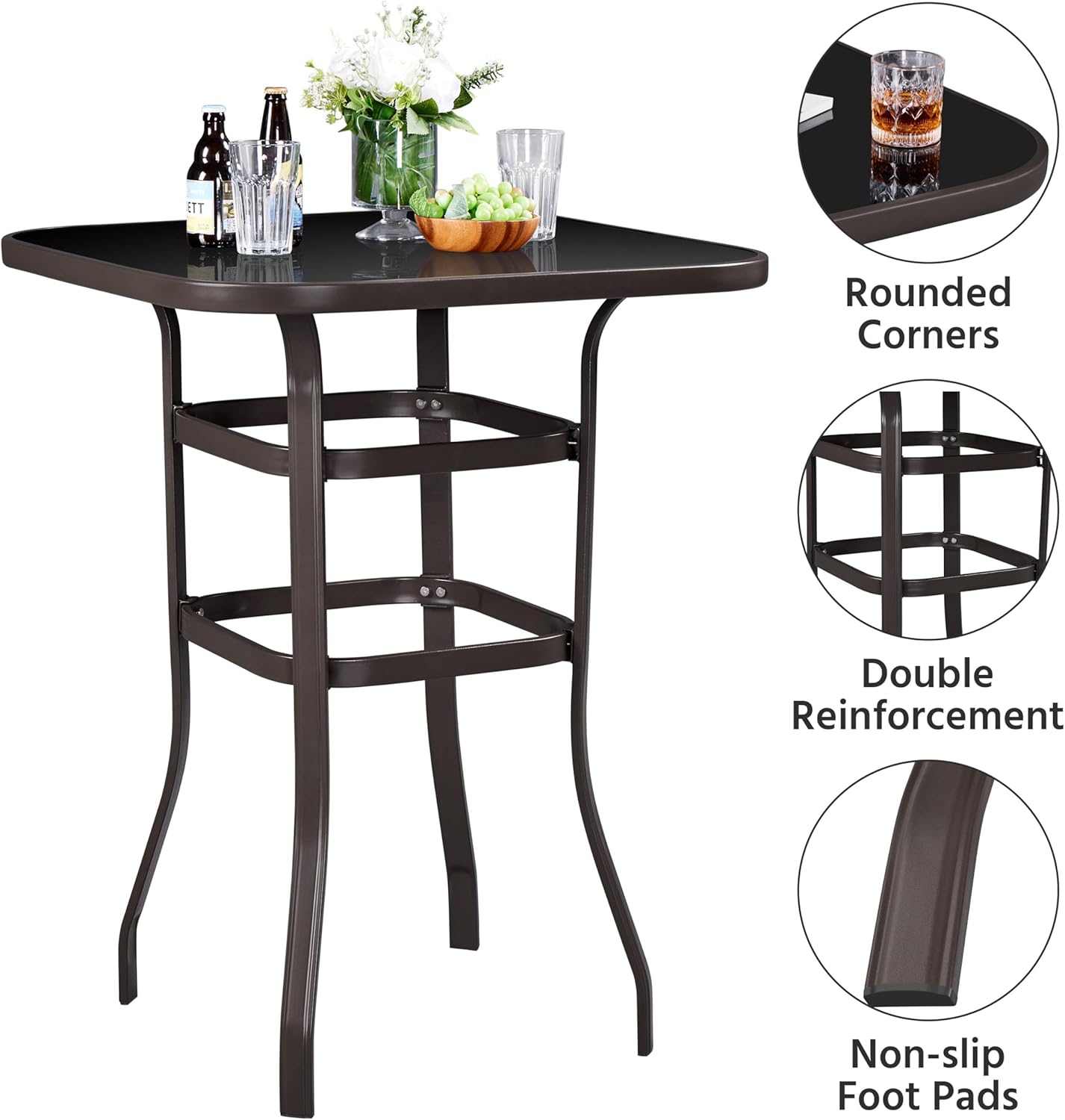 Tempered Glass: The tabletop of this garden bar height table is made of tempered glass, which is extremely hard to break. It does not fade in any way compared with other spray-coated tables. The surface is glazed and does not change in shape or have scratches
